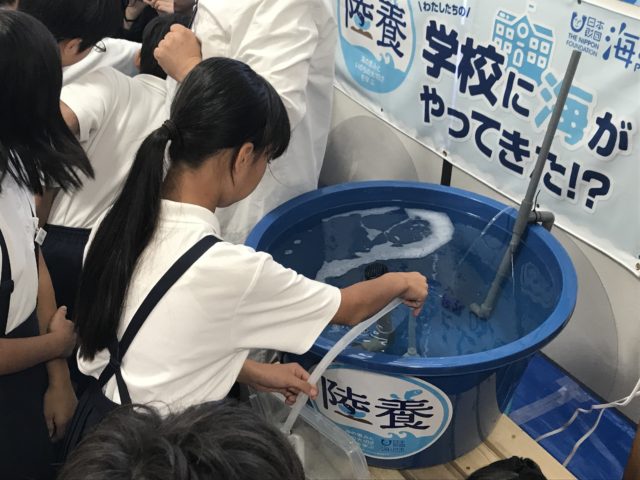 毎日のお世話には、魚が食べ残したエサやフンを吸い取って、常にきれいな海水を保つことが大切です。子どもたちがすべて行います。