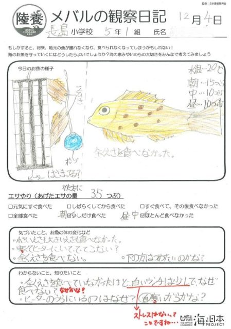ポンプとヒーターに隠れたメバルも詳しく書いてくれています。今日はあまりエサを食べなかったようです。