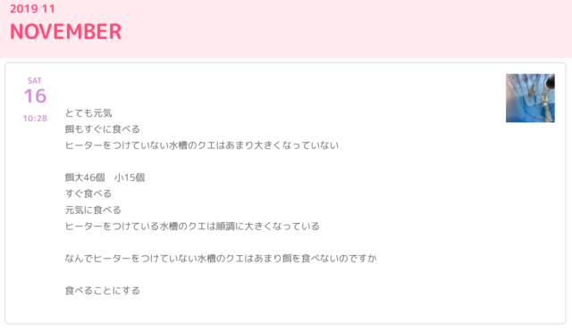 ヒーターをつけた水そうのクエは順調に成長。水温は、魚の成長にとって大切なことのようです。