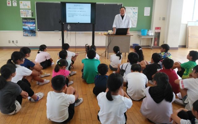 千葉県の北・内陸部に位置する野田市。海と普段接する機会は少ない子どもたちです。魚の養殖は何のためなのか。真剣に日本養殖振興会・斉藤先生のお話を聞きます。