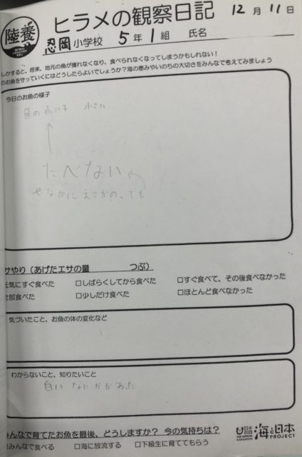 目の赤いヒラメ「レッドアイ」、体も小さい様子。背中にエサがのっても気づくかな?