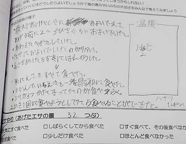 1月12日 毎回エサを食べるときに少しジャンプしていた。1ぴき以外はうすい色になっていた。