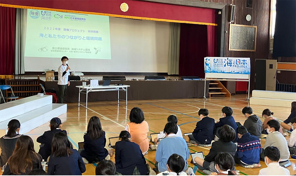 国立環境研究所からは、海の環境問題の専門家である地球システム領域地球環境研究センター大気・海洋モニタリング推進室の髙尾信太郎さんによる出前授業を開催しました。まず、海の環境問題のうち、特に地球温暖化による影響を児童たちにもわかりやすくお話いただき、海の生態系が私たちの暮らしとつながっていることも教えてくれました。また、地球温暖化の主要な原因のひとつでもある二酸化炭素の増加が海洋の酸性化も引き起こすことに触れ、その現象をみんなで実験キットを使って体験しました。最後に、こうした海の環境変化によって将来お寿司が食べられなくなる可能性があること、そしていま児童たちが進めている陸上養殖がひとつの解決策として、海や魚を守ることを学ぶ大切な機会であることも教えてくれました。