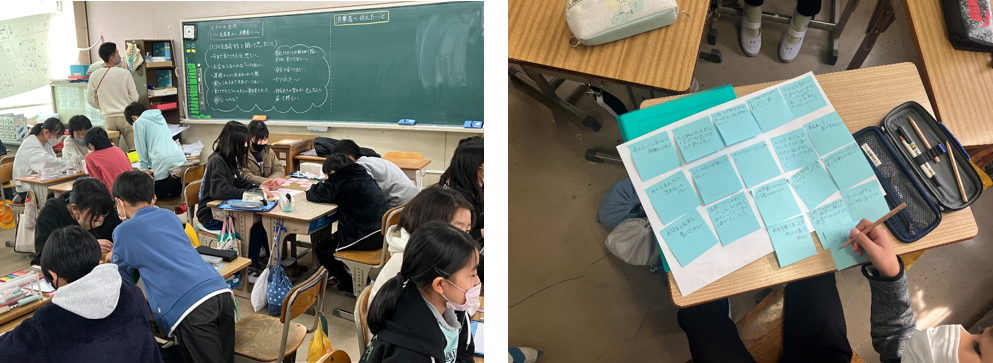 2月1日(水)に開催した「発表資料作り」の授業では、作業に入る前に、まず講師の齊藤先生から養殖やセリについてのお話をお聞きし、このあとの「出荷」からどのような流れでお魚は私たちの食卓に届くのかを改めて学びました。これまでの活動を振り返った後、グループに分かれて「生産者として消費者に伝えたいこと」をテーマに意見を出し合い、次回の授業で発表するための資料を作りました。話し合う過程では「生産者には色々な工夫や苦労があるから、大事に食べてほしい」「毎日育ててきたので味わって食べてほしい」「育てる難しさを知ってほしい」「食べられるありがたみを感じてほしい」などの意見が出ました。生産者の立場で様々なことを学んできたからこそ出てくる「消費者に伝えたいこと」をみんなで真剣に話し合う姿が印象的でした。