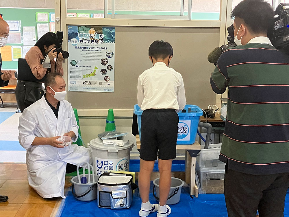 ヒラメ専用の水槽の設置から少しの期間を空けて、いよいよヒラメを受け入れる日がやってきました。NPO養殖振興会代表理事の斉藤先生がヒラメの育て方や注意点についてお話をされ、児童たちは改めて命を育てる・預かるということについて気を引き締めているようでした。